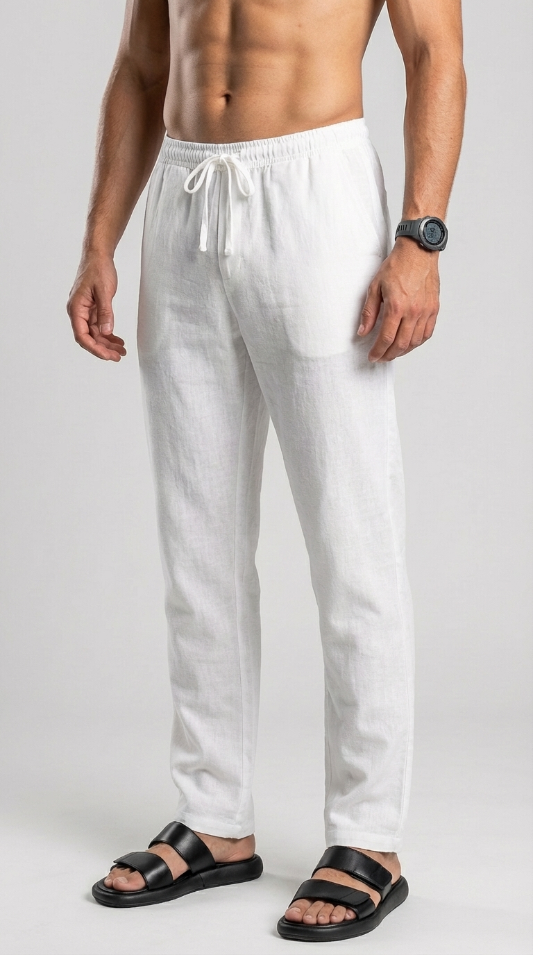 A Calça Zyou é feita com 30% linho + 70% viscose, trazendo um caimento suave, toque fresco e respirabilidade perfeita para dias quentes. Possui cintura elástica com cadarço, bolsos faca e corte reto que alonga a silhueta.